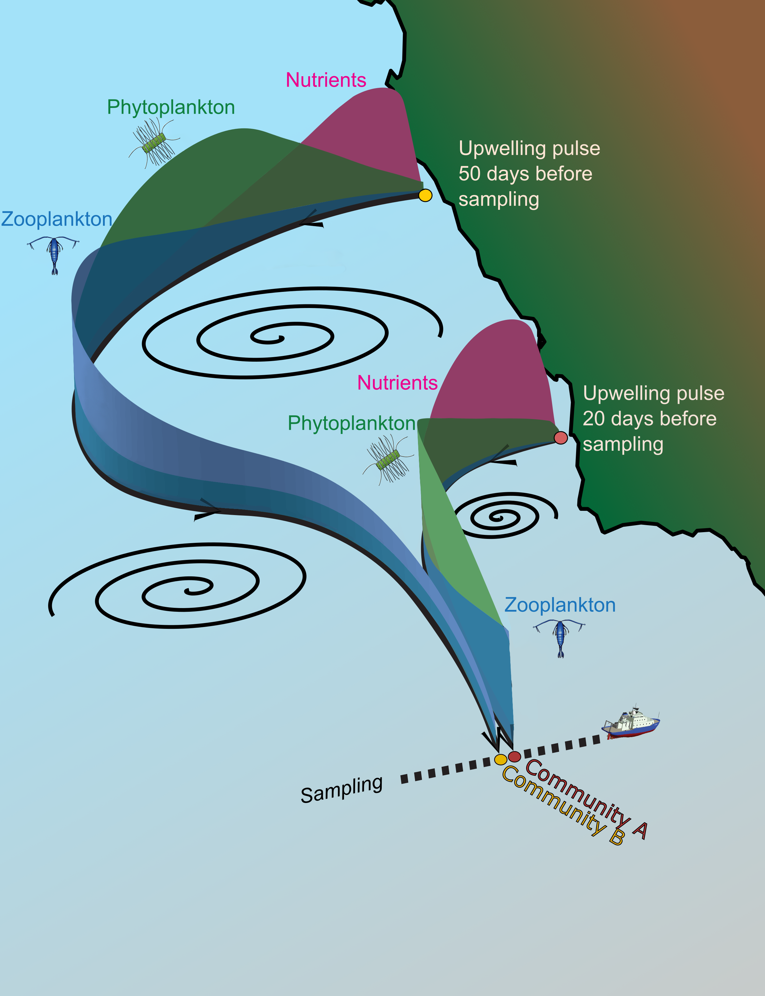 Swirling ocean currents are able to tranport passively drifting plankton hundreds of kilometers within several days. Therefore, as entire planktonic ecosystems are transported, they also undergo ecological succession: communities shift from large to small phytoplankton, and zooplankton such as copepods proliferate in response to prey populations. Stationary measurements by ships or sensor platforms often only capture a “patch” of plankton passing by, but particle-tracking techniques allow us to reconstruct the histories of water parcels to evaluate how ecosystems change along these trajectories.
